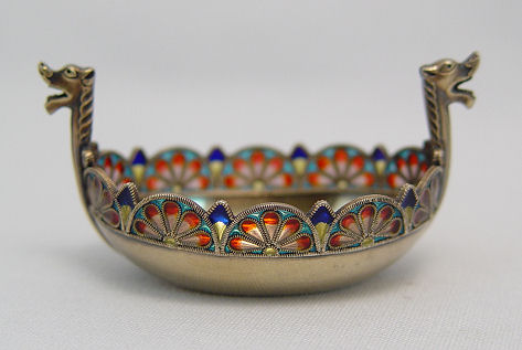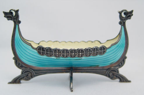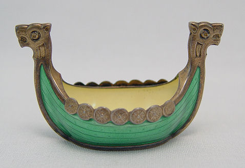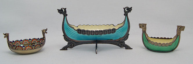 GROUP OF THREE NORWEGIAN PLIQUE AU JOUR AND ENAMELED VIKING SHIP SALTS: The smallest is the plique au jour by David Andersen, 2 1/2''l. x 1 1/4''h. The next is green enameled, also hallmarked and stamped 925. The third and largest ship is a master salt in blue enamel with no markings, 4 1/2''l.