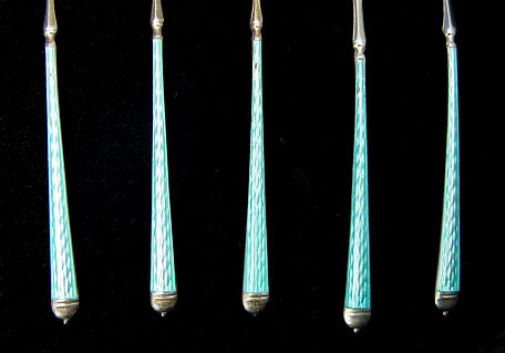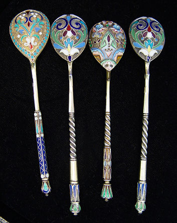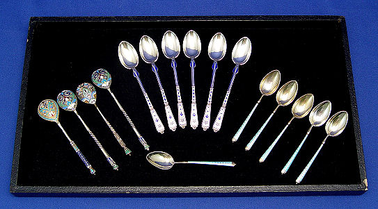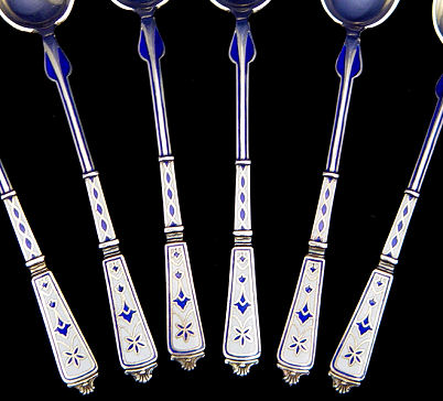 3 GROUPS OF ENAMEL STERLING DEMI-TASSE SPOONS: 16 spoons to include 1) Six spoons from P.Hertz, purveyors to the king and queen of Denmark. The matched set has cobalt and white enameling, the spoons are 4 3/4''l, marked P. Hertz 930S. 2) Six enamel spoons by Watson, 3 7/8''l. 3) Four Russian enameled spoons bearing marks indicating 1896-1808, silver purity 88, 4 1/2''l.