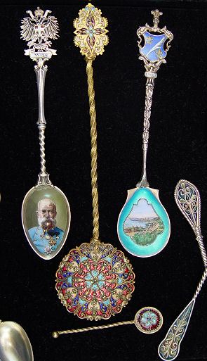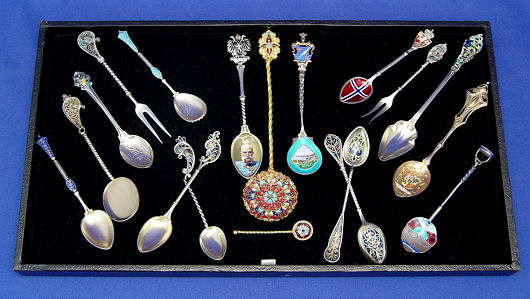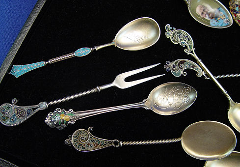 EXOTIC COLLECTION OF STERLING ENAMEL SPOONS: 18 piece collection featuring portrait spoon and including plique a jour and polychrome enamel. The spoons hail from Denmark, Dominick & Haff, Norway. There is also a salt spoon and appetizer picks in this group, some are sterling, there are also 800 silver.