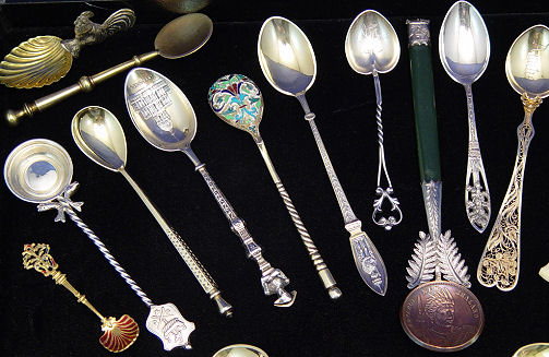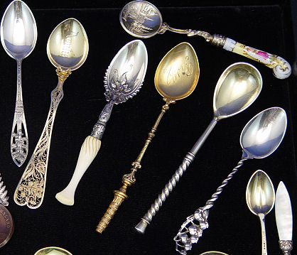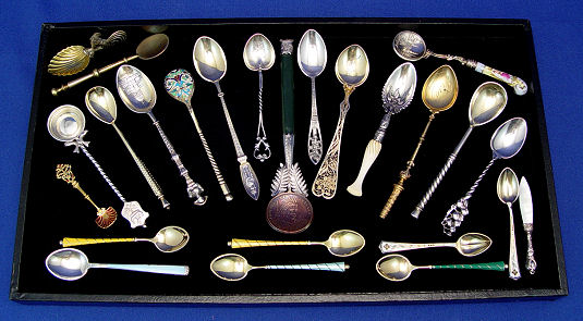 ESTATE COLLECTION OF STERLING AND ENAMEL SPOONS: 25 pieces to include Danish and Norwegian enamel, Whiting ivory handle spoon, Dresden porcelain handle spoon, German, French, Gorham enamel salt spoon. 3- 4 3/4''l.