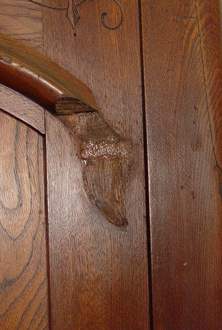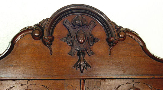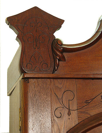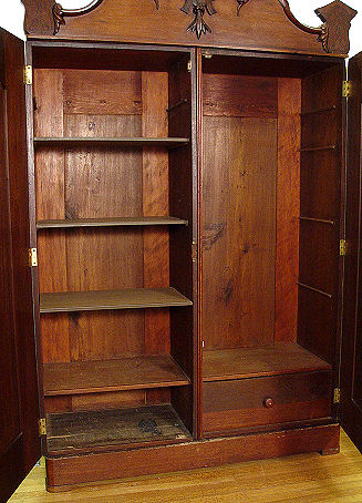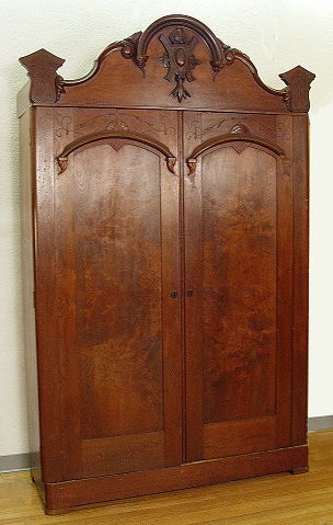 19TH C WALNUT ARMOIRE: Fine applied carvings to the two door wardrobe. Interior has shelves on half, space for clothing rod on the other and half length drawer. 8' tall. x 4'9'' x 21''.