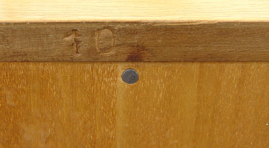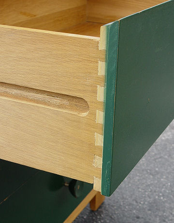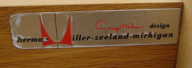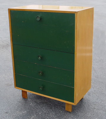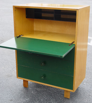 GEORGE NELSON FOR HERMAN MILLER DROP FRONT DESK: Original green lacquered front. Drop front desk with interior cubicles and door over 4 drawers. Foil label. The finish has mars. 45''h. x 34'' x 18''.