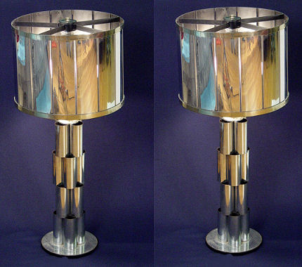 HIGH STYLE PAIR OF 1960'S 2 CHROME TABLE LAMPS: Paneled shades let the light shine through. Base and shade are both chrome. 36''h, shades are 16'' dia.