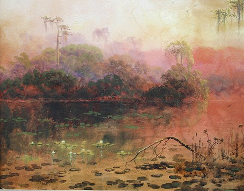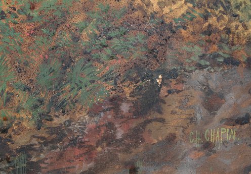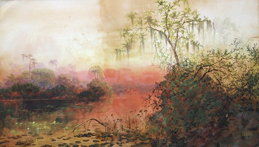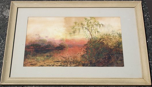 CHAPIN, Charles H, (American, 1830-1889): Bayou scene, W/C, 12'' x 20 1/2'', signed lower right, size with frame, 19'' x 28''. Condition - Paper laid on board, paper does have some water damage and staining as evident through images provided, small speck of paper loss lower right, minor creasing in upper left corner. Est. $1000/1500**