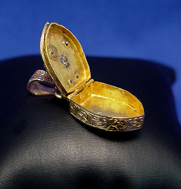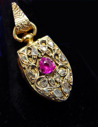 ANTIQUE FRENCH DIAMOND & RUBY CASKET PENDANT: Shield shaped pendant of 20k plus (assayed) gold, etched scroll design to sides, hinged top set with slightly oval ruby and mine? cut diamonds, no mark found estimated French late 18th C, 8 grams, 1 1/2''l. with new bail.