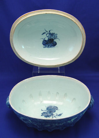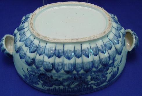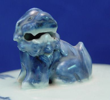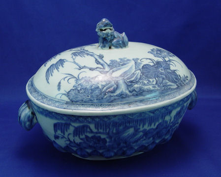 BLUE & WHITE COVERED DISH: Landscape design with shell handles and foo dog finial, overall approx. 13'' x 10'' x 9'', Actual age and maker unknown.