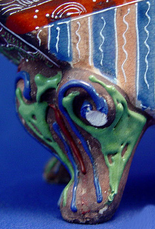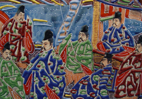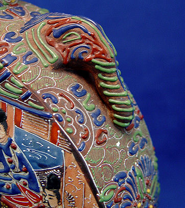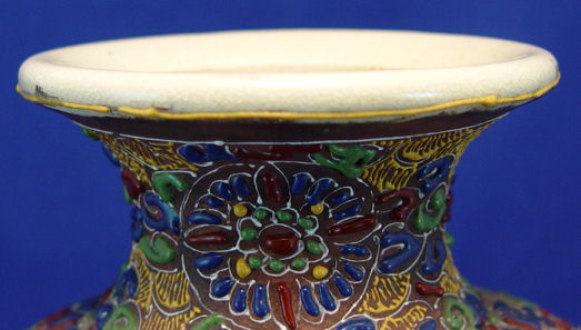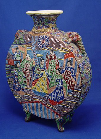 LARGE JAPANESE MORIAGE DISC VASE: Most colorful earthenware in heavy enamel decoration. 12'' dia. 15''h.