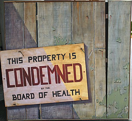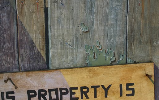 MEZZANO, Charlie, (American, 20th C): ''This Property Is Condemned'', Mixed Media/Tromp L'oeil, overall measurements 43'' x 45 1/2'', signed lower left and dated 1977. A most unusual canvas Tromp L'oiel with protruding nails, faux painted rust marks and applied paint chips. A must for your antique store! Condition - Several small abrasions, good overall.