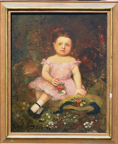 19TH/18TH? C. PORTRAIT OF A YOUNG FEMALE CHILD: O/C, 36'' x 19'', no visible signature, contained in a worn gold frame with missing gesso, 43'' x 35 1/2''. Condition - Piece has been cut, re-lined, restorations and craquelure throughout, needs work, sporadic paint fleck, numerous portions of in-paint. Sold as is.