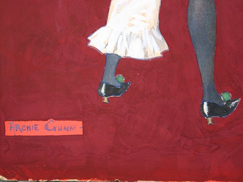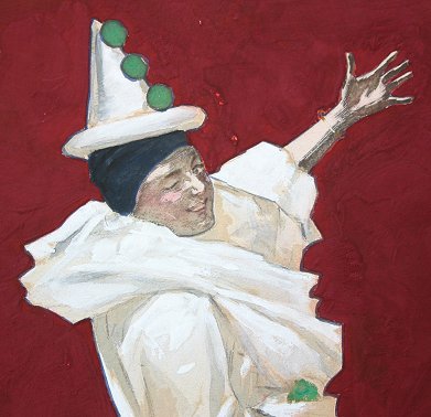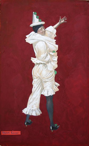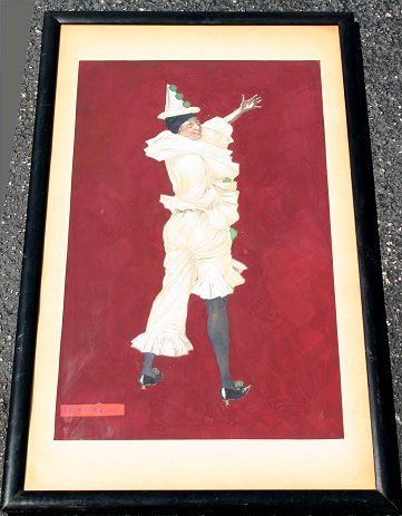 GUNN, Archie, (American, 1863-1930): Clown/Harlequin, illustration, Gouache, 24'' x 14 3/4'', signed lower left, worn frame 30'' x 18 1/2''. Condition - Paper laid on board, small repair in left margin, several areas of minor paint flake.