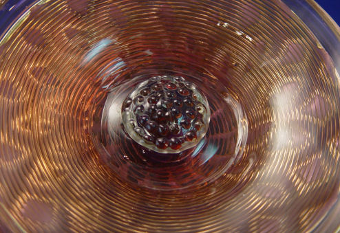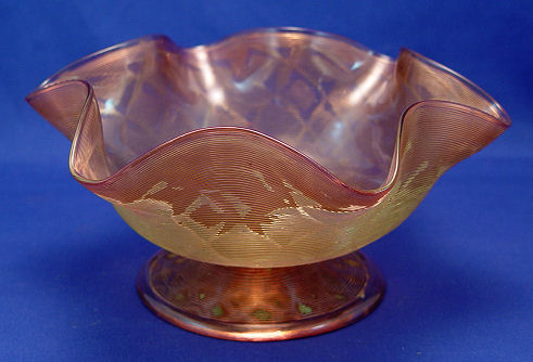 VERY UNUSUAL THREADED ART GLASS BOWL: Pattern and color change with a twist in the light. Berry type pontil. 10'' dia. x 4 1/2''.