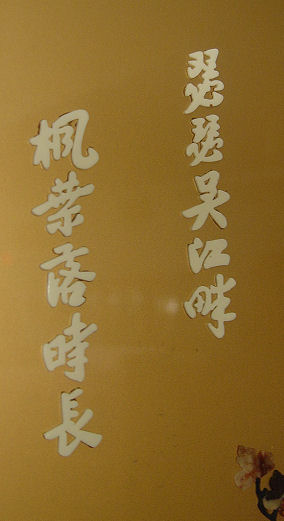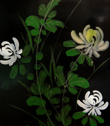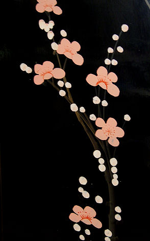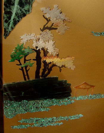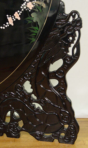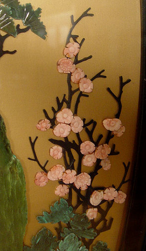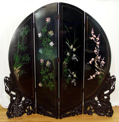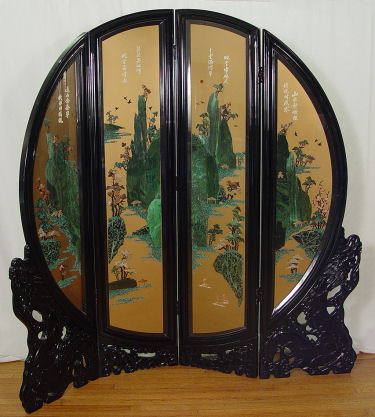 FOUR PANEL CHINESE MOON SCREEN: Carved stone scenic panels under glass, verso is hand painted. Unusual large circular shape when open. Applied carving to the side bottoms. Black lacquer finish. 74''h. x 74''.