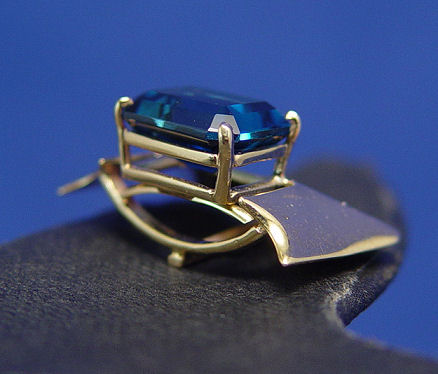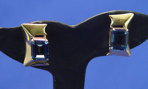 BRIGHT BLUE TOPAZ EARRINGS: Emerald cut stones in a teal blue shade set in 18k yellow gold opposing half box mounts, marked 18k, with 14k jumbo backs, 8.8 grams.