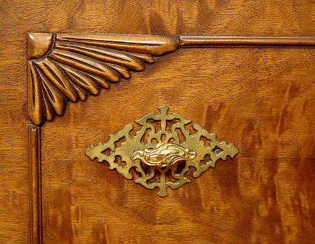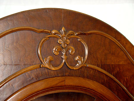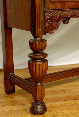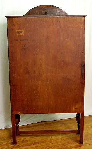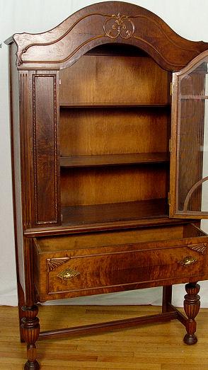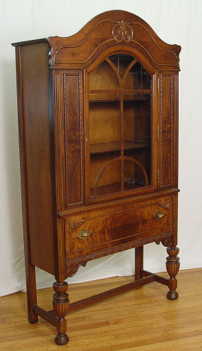 HUNTLEY SIMMONS CHINA CABINET CA. 1929-1935: American Gothic style with single glass door, full length drawer, and heavy turned legs. Burled walnut veneers. Huntley Simmons merged with Thomasville in 1961. 71''h. x 37'' x 14 1/2''.