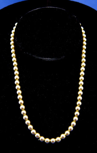 14K YELLOW GOLD BEAD NECKLACE: 16'' chain strung with 6mm gold beads, clasp marked 14$, approx. 18 grams total.