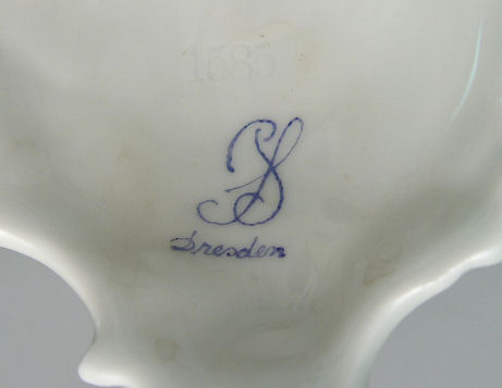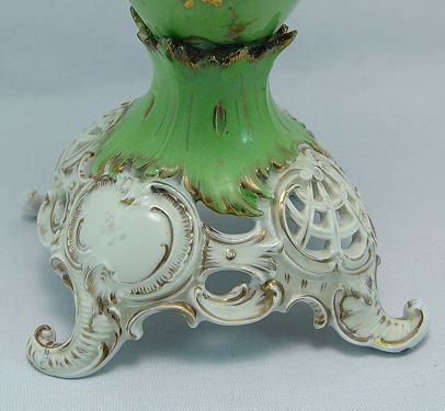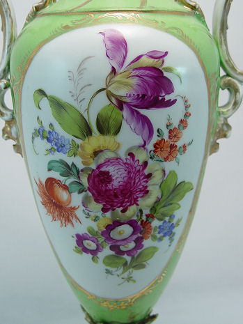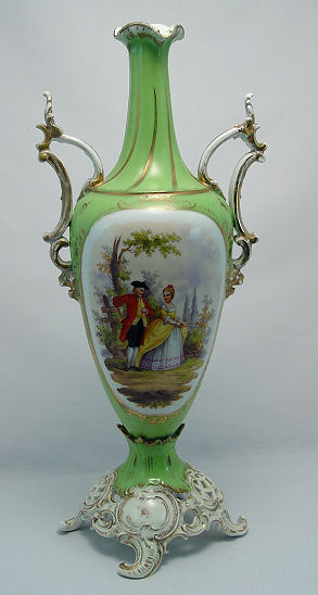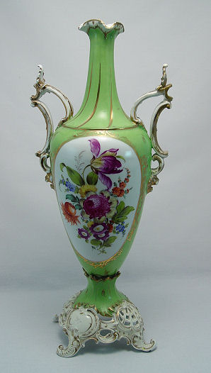 DRESDEN SAXONIAN PORCELAIN VASE: Hand painted floral reserve, courting scene verso. Ornate scroll handles, reticulated base with scrolled feet. Mark of Carl Thieme, Potschapel. 19 1/2''h. Please call for condition.