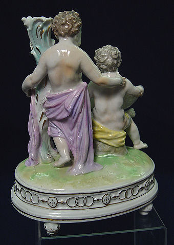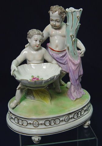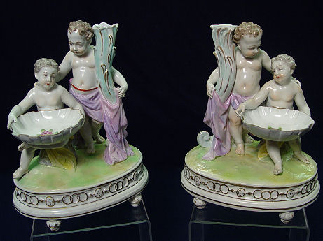 DRESDEN SAXONY PORCELAIN PUTTI FIGURES: Mirror image pair of figures mountable as lamps. 8 1/4''h., 6 3/8'' base. Bears the mark of Carl Thieme, Potschappel.