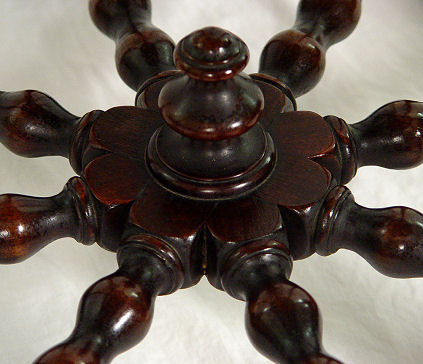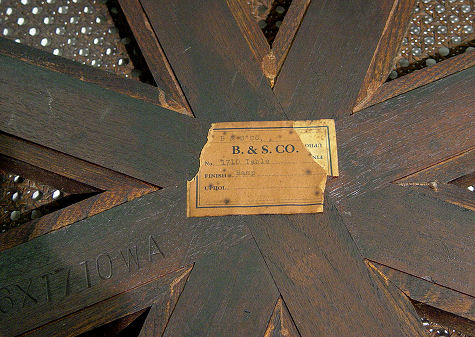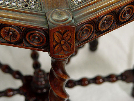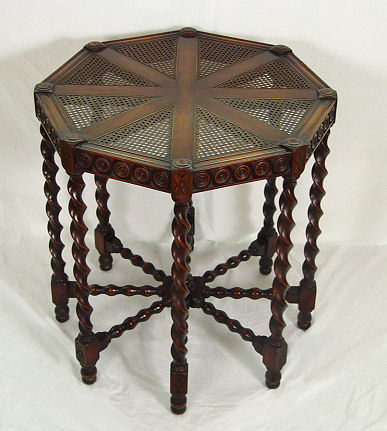 CARVED MAHOGANY OCTAGONAL CANE TOP CENTER TABLE: Eight panels of caning framed in carved apron. Lower tier of eight turned ''spokes'' connect the eight spiral carved legs. 28 1/2'' x 26 1/2''. BS & Co paper label.