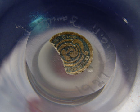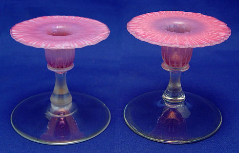 TIFFANY PINK FAVRILE ART GLASS CANDLE STICKS: Signed ''LTC Favrile 1927'', large percent of the paper label is intact. The bases are clear, one does have a chip at the base. 3 3/4''h, 4'' dia.