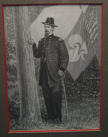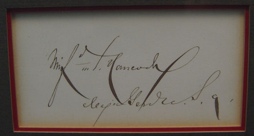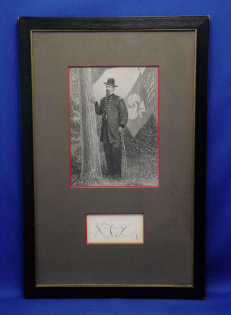 HISTORICAL AUTOGRAPH & ENGRAVING OF MAJOR GENERAL WINFIEL S. HANCOCK: A General of the Army of the Potomac. Wounded at Gettysburg, Commander of corps for the Wilderness Campaign of 1864, battles of Spottsylvania, Cold Harbor, and the opening weeks of Petersburg. Ran for president as a democrat against James Garfield in 1880. Etching and autograph framed and matted under glass. 11'' x 4 1/2''.