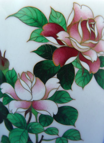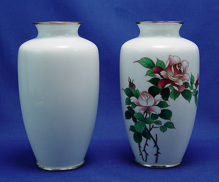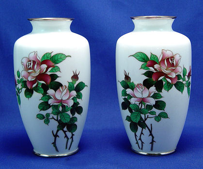 PAIR OF ROSE DECORATED CLOISONNE VASES: Smooth white ground with opposing red rose bush decorations, silver metal rims, no signature found, approx. 7''h.