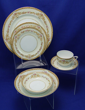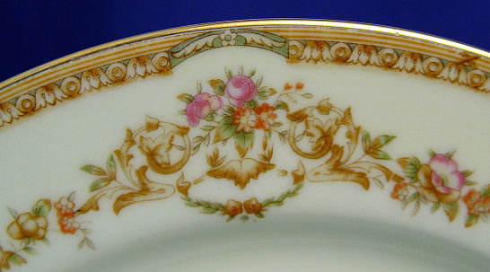 NARUMI OCCUPIED JAPAN FINE CHINA SERVICE: Gold rim with gold floral design and a touch of pink and green. 86 pieces to include an oval vegetable bowl, 16'' platter, 12'' platter, sugar & creamer, 12 each of 10'' dinner plates, salad plates, bread plates, dessert bowls, and 1l soup bowls, 10 cups & saucers with extra saucers.
