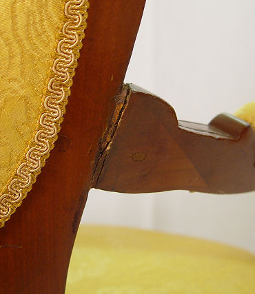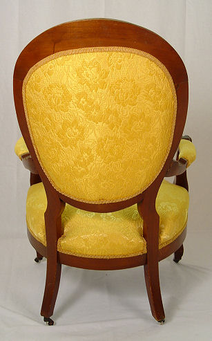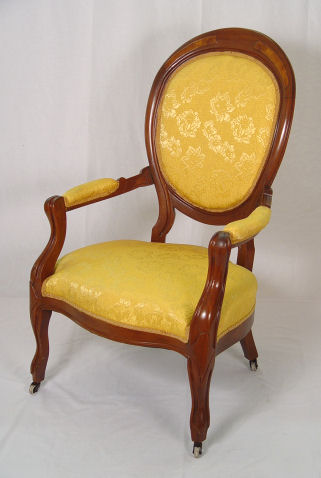 VICTORIAN WALNUT PARLOR CHAIR: Balloon back arm chair with gold brocade type contemporary upholstery, 39''h.x 24''w. x 20 1/2''d.
