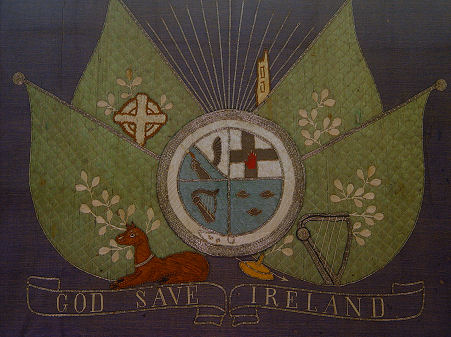 GOD SAVE IRELAND HAND EMBROIDERED SILK ON SILK: Framed and matted under glass, worked in silk and metallic threads. Textile is 17'' x 15'', 22'' x 24 1/2'' overall.