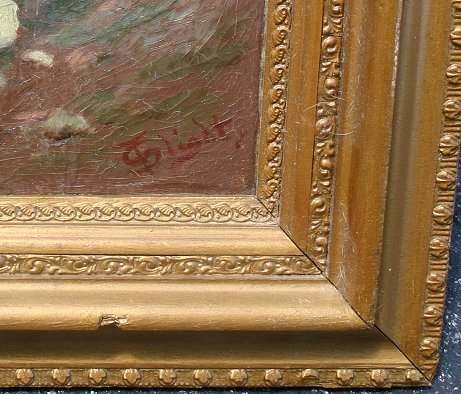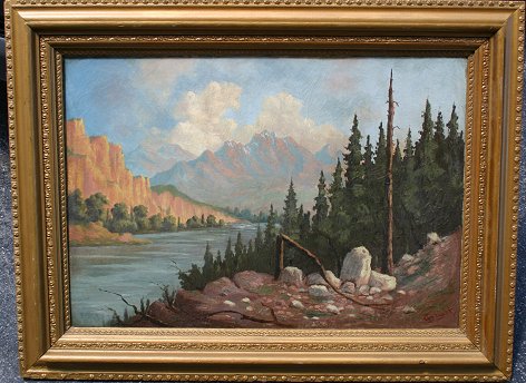 WESTERN RIVER VALLEY LANDSCAPE, O/C/Board: Signed lower right T.Slight?, 24'' x 34'', encased in overpainted gold frame with wear, 32 1/2'' x 42 1/2''. Condition - Heavy craquelure throughout, needs cleaning.