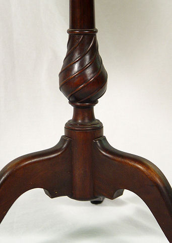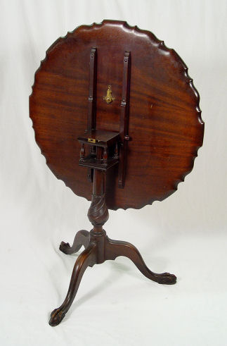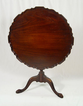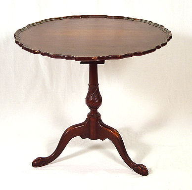TILT TOP MAHOGANY TEA TABLE: Revolving pie crust table, bird cage over spiral carved pedestal, three legs ending in ball and claw feet. 23 3/4''h. x 32'' dia.