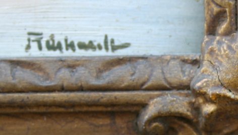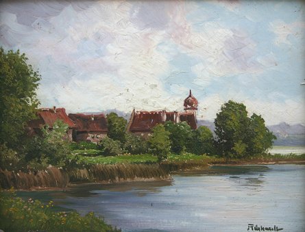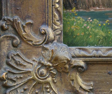 GOOD EUROPEAN O/B PAINTING OF A VILLAGE ON A RIVER: Overall size with period gilded and embossed frame is 9 1/2'' x 11'', illegibly inscribed lower right and faint markings lower left, some damage and wear to frame, good overall condition.