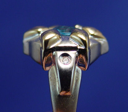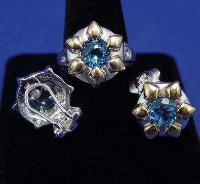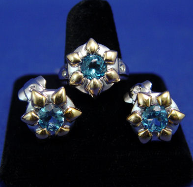 BLUE TOPAZ RING AND EARRING SET: Adorable floral mount of 14k white and yellow gold, set with matching round brilliant cut blue topaz, approx. 7 mm x 4.5mm each. Ring size 7.5, earrings with omega backs. Overall 17.8 grams.