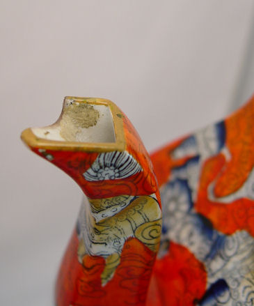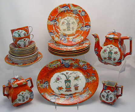 19TH C ASHWORTH STAFFORDSHIRE CHINA: Brightly colored enamel enhanced transferware set to include teapot (spout chip), covered sugar, creamer, 6 plates (8 1/2'' dia.), 6 dessert bowls, 2 cups and saucers, extra saucers, and a platter (11'' dia). Please call for condition.