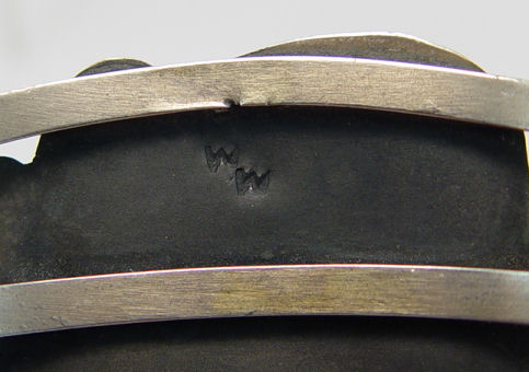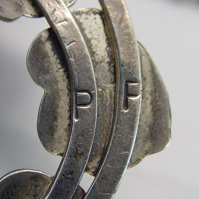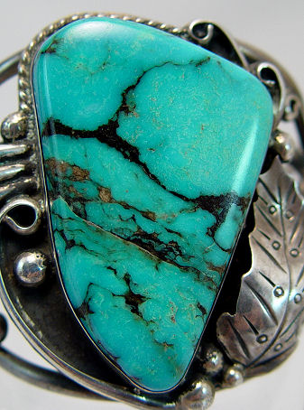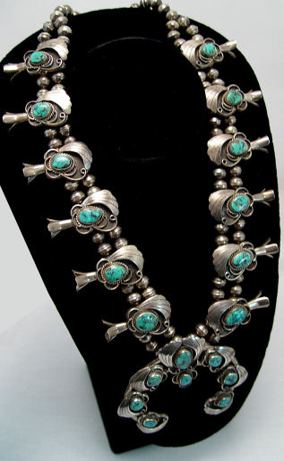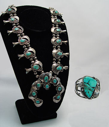 SIGNED NAVAJO SQUASH BLOSSOM NECKLACE AND BRACELET: Turquoise and silver necklace with a 3 1/2'' naja and 12 blossoms on double bead 25'' chain by Paul Frank, signed verso. Sold with a cuff bracelet featuring a truly lovely piece of turquoise set in silver foliate design, approx. 2 1/4'' on top, adjustable cuff currently open to 2 3/8'', by Wilber Wauneka, signed verso. Sold as a lot.