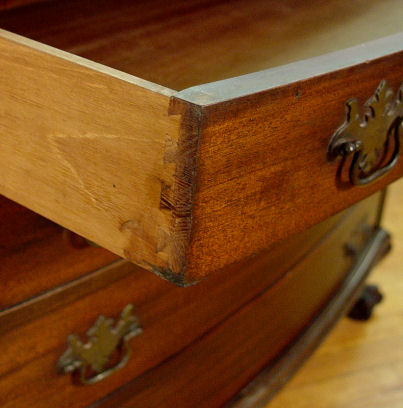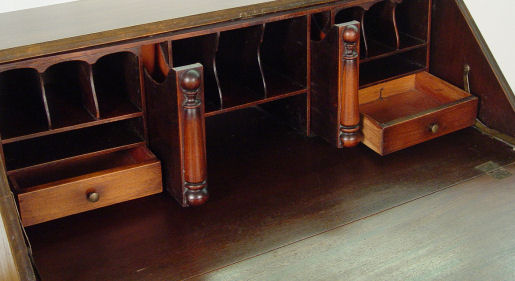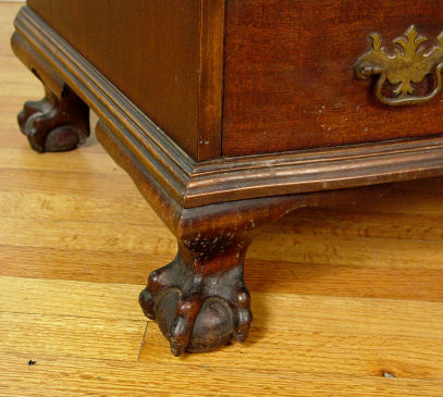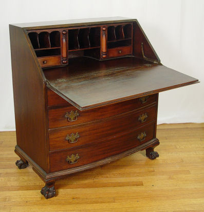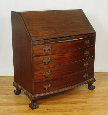 MAHOGANY SLANT FRONT DESK: The interior is fitted with pigeon holes, drawers, and secret drawers. The bowed front bottom section has four drawers. Carved ball and claw feet. 41''h. x 36'' x 19''.