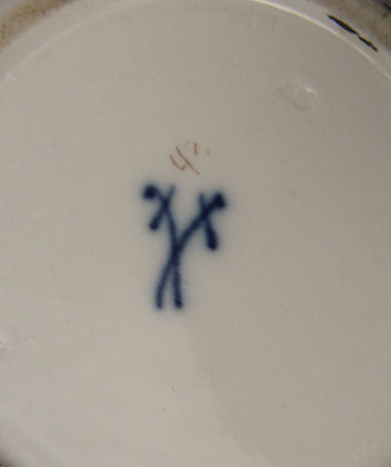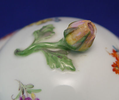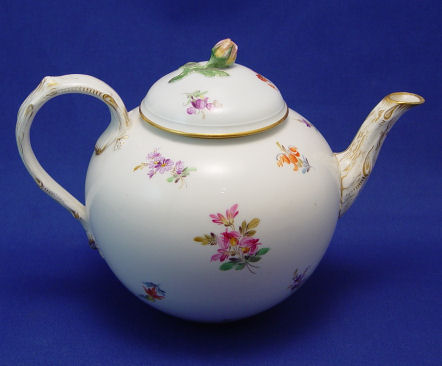 MEISSEN PORCELAIN TEAPOT: Rose finial on the lid, floral sprays on the body, the spout is gilt enhanced in a bark manner. Blue cross swords under glaze. 6''h. overall.