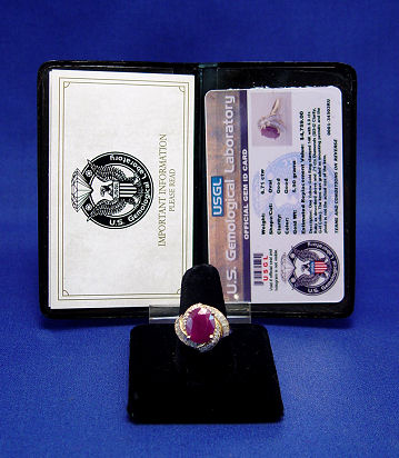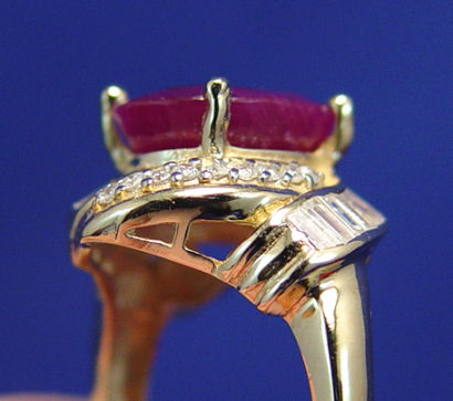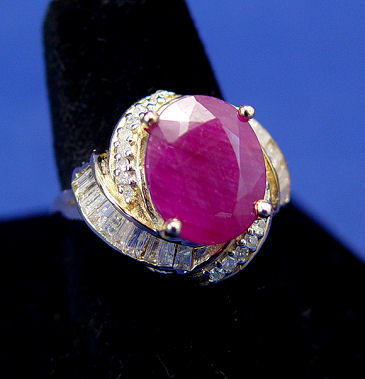 6.7CTW RUBY & DIAMOND RING: Centered by a 6ct oval cut ruby, set in 14k yellow gold with round and baguette cut diamonds, approx. 71pts total, size 7, 6.4 grams. Sold with a USGL Gem ID Card, estimated replacement value $4759.00.