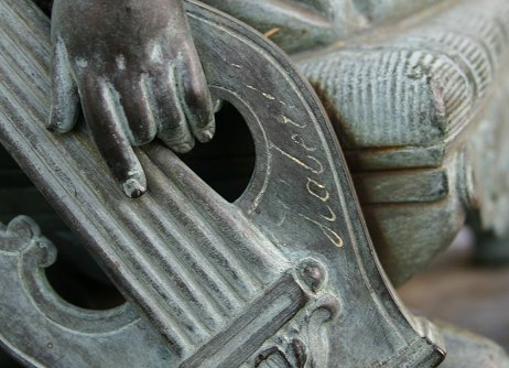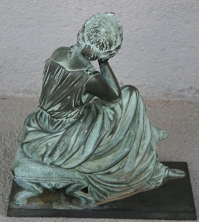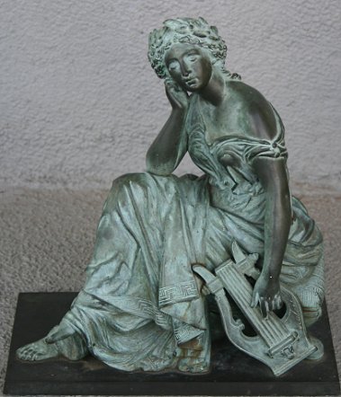 HABERT, Alfred, (French, 1824-1893): Musical maiden, Bronze with green patina, 9''h, incised signature on the lyre, wear throughout, good overall condition.