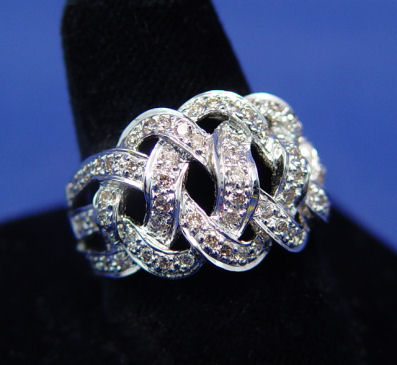 WOVEN FILIGREE DIAMOND RING: Diamond encrusted eternal knot of 14k white gold, size 7.5, 8.7 grams.