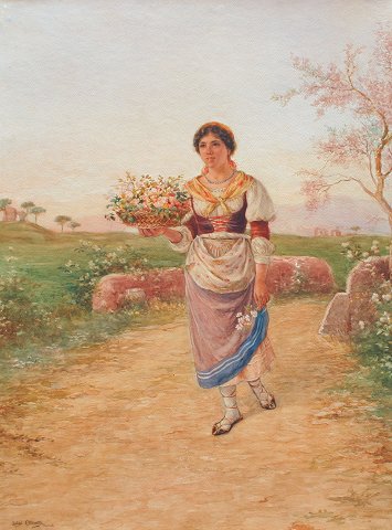 OLIVETTI, Luigi, (Italian, 19th C): Flower Girl, W/C, 29'' x 22'', signed lower left Luigi Olivetti, Roma, encased in a carved and gilded frame, 33 1/2'' x 26''.
