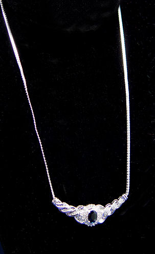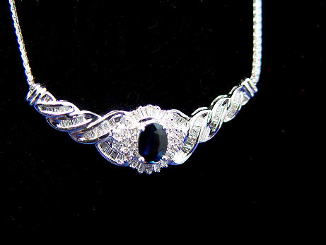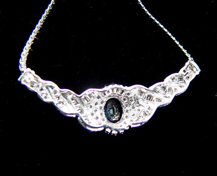 SAPPHIRE & DIAMOND NECKLACE: Centered by an oval cut sapphire, 8 x 5.8 x 3.5mm, set in twisting chevron encrusted with round and baguette diamonds, marked 14k Italy, 18''l., attached flat link chain, 7.6 grams.
