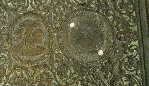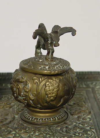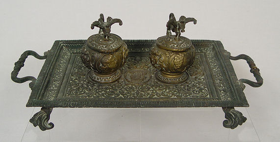 HEAVILY EMBOSSED DOUBLE INKWELL TRAY: A pair of hinged top inkwells embossed in portraits, surmounted by griffins. The tray has all over embossed design. Tray is 8 1/2'' x 14 1/2'' including handles. Bottles are 4''h. No inserts.
