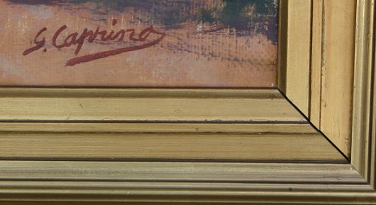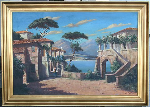 LARGE MEDITERRANEAN O/C COASTAL SCENE: 31 1/2'' x 47 1/2'', signed lower right G.Capriszo, encased in a worn gilded frame, 39'' x 54 1/2''. Condition - Several minor abrasions, but good overall, needs cleaning.