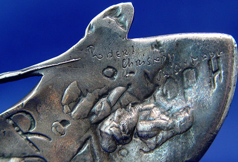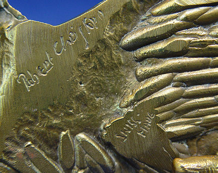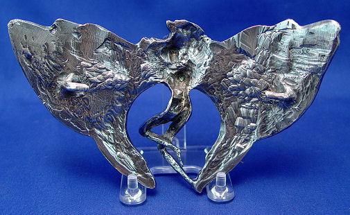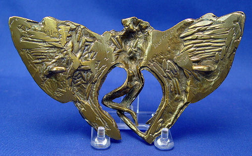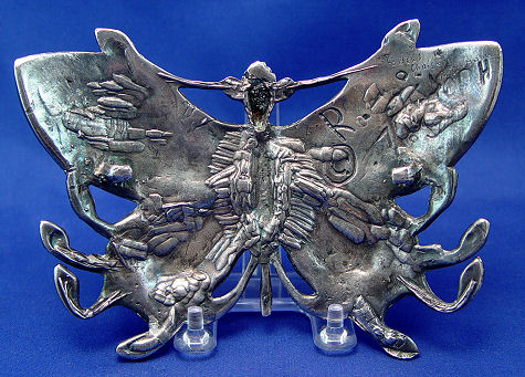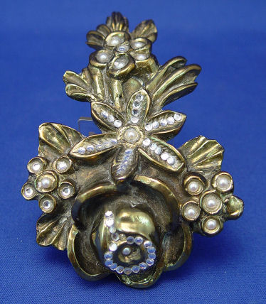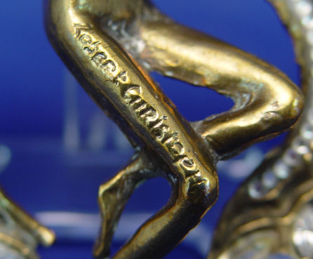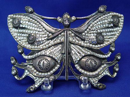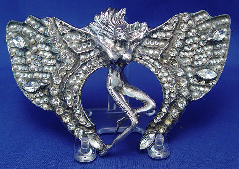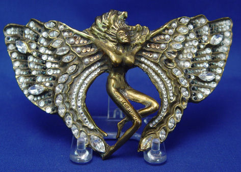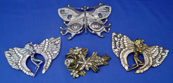 CHRISTOPH, Robert, (Swiss, 20th C): Four cast metal figural buckles, 1)Moth of white patinated metal set with faux pearls and round white rhinestones, marked verso Robert Chrostoph Swiss Made and with partially eclipsed large signature & C in circle, 4 3/4''h x 6 3/4''; 2)Winged woman of white patinated metal set with round and marquise white rhinestones, signed front of right leg, 4''h x 6 3/4''; 3)Winged woman of bronzed patinated metal set with faux pearls, round and marquise rhinestones in white and black, signed to front right leg and verso Robert Christoph Swiss Made; 4)floral bouquet of bronzed patinated metal set with faux pearls and rhinestones, unsigned but attributed to, 3 1/4'' x 5 1/4''. Sold as a lot, some missing stones to all.