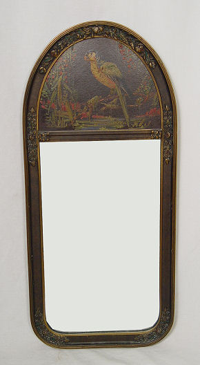 1920's PARROT DECORATED MIRROR: Original hand painted polychrome frame with arched top. 32'' x 14 1/4''.