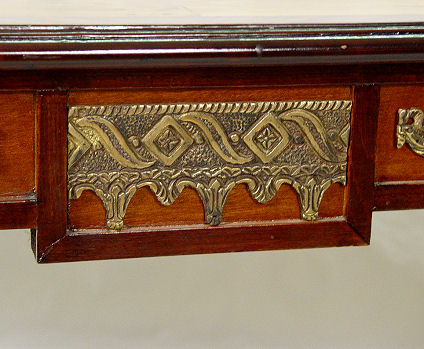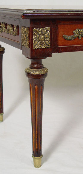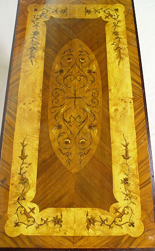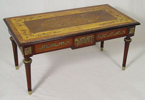 BURLED AND MIXED WOOD MARQUETRY INLAY COFFEE TABLE: French style table with ormolu feet, a glass cover has protected the surface from wear. 19 1/2''h. x 39 1/2''.