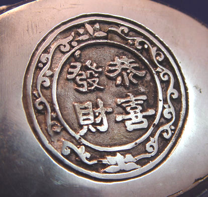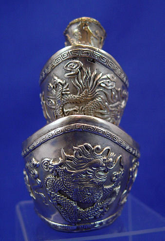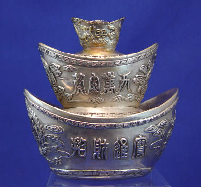 CHINESE SILVER SYCEE: Three tier sycee carved with dragons, phoenix and Buddha, approx. 6''h., 5 1/2'' x 3 1/4'', 1450g. Actual age unknown.