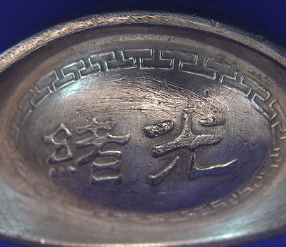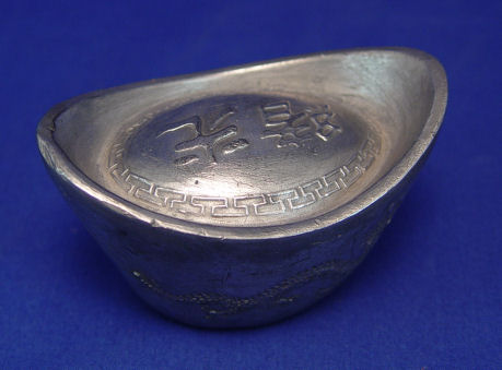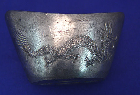 CHINESE SILVER INGOT SYCEE: Dragons to each side, character marks to top and bottom, purported Guang Xu period, Actual age unknown. 850 grams.