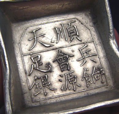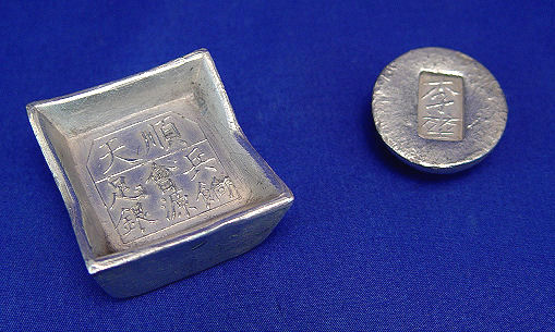 LOT OF TWO SMALL CHINESE SYCEE: Purported exclusively for military use in ancient China, no decorative carvings, character marks only to tops of each. Square 450 grams and small round 130 grams. Actual age unknown.