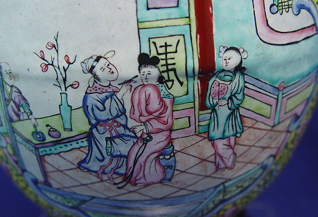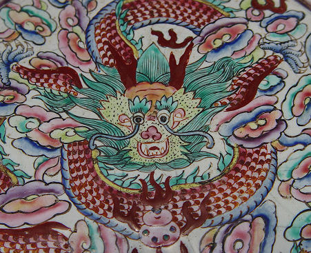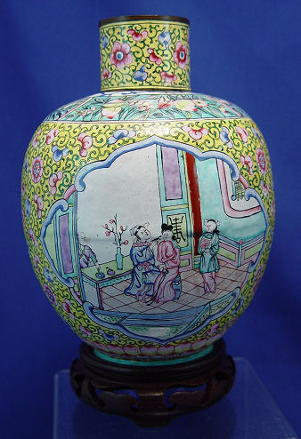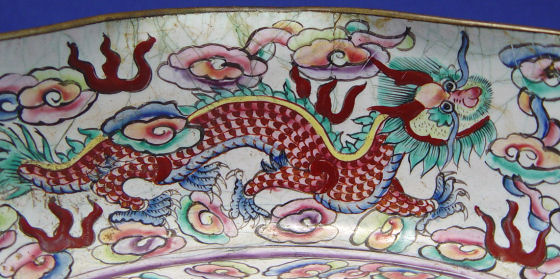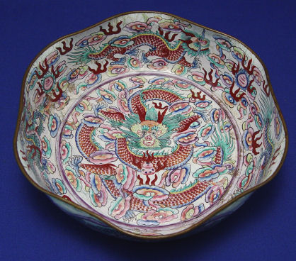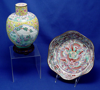 CANTON ENAMEL BOWL AND TEA JAR: The bowl is a dragon design, 9'' dia. marked in characters on the underside, uneven craquleure to the enamel. The tea jar is 8'', unmarked.